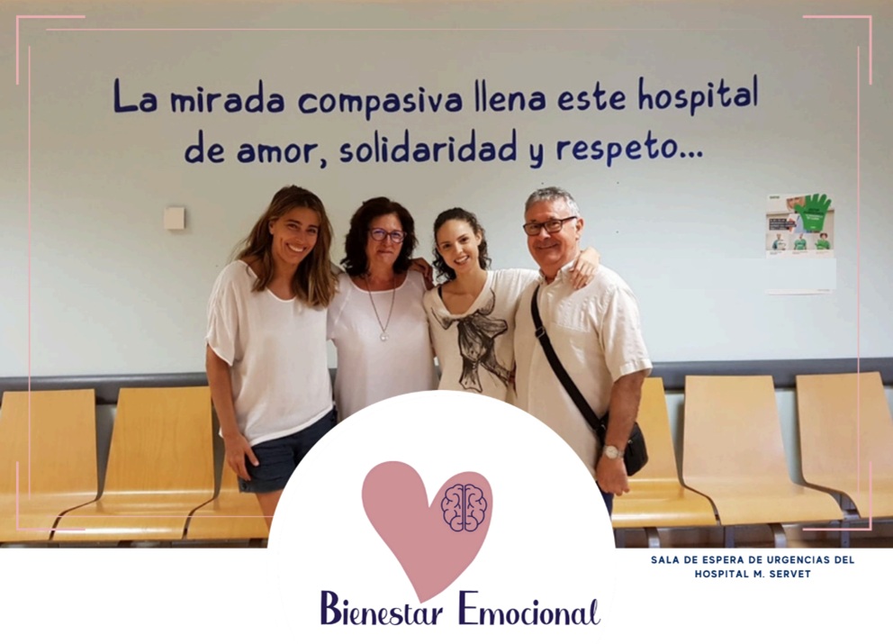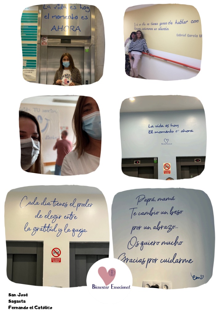 Desde 2018, nuestra entidad ha realizado el proyecto “Calma, Respira y Confía” en diferentes espacios del Hospital Miguel Servet, llenando de frases con un mensaje claro de acompañamiento, comprensión y respeto por la situación que viven a diario pacientes, familiares y amigos.